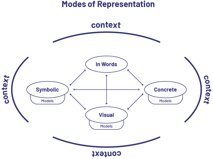 Teachers need to be aware of the order in which they should introduce these four modes of representation with students. Baroody and Coslick (1998, pp. 3-8 to 3-16) suggest that a new concept should be presented in a real and meaningful context so that students can first create representations using words, followed by concrete and visual representations. Only when students have developed some understanding of the concept can they move on to its symbolic representation. Students should be able to make connections between representations and move easily from one representation to another.