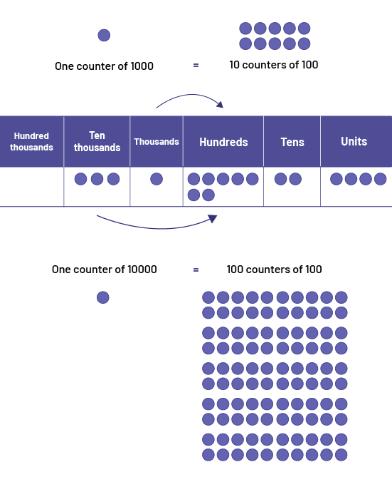 Another way to check for understanding is to ask students, for example, how many hundreds there are in 31 724. Many students will say that there are 7. It is important to clarify that the number in the hundreds position is a "7", but that the number 31 724 actually has 317 hundreds (317 groups of 100 per group). We can recognize these hundreds by regrouping the ten thousands and the thousands into hundreds. A counter that represents ten thousand is equivalent to 10 counters of one thousand and 100 counters of one hundred. So, 3 ten thousands represents 300 hundreds, and 1 thousand represents 10 hundreds. We must then add the 7 hundreds to the 310 hundreds obtained in the grouping, for a total of 317 hundreds.