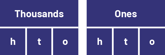 Numbers are represented symbolically by the digits that make them up. They are written from left to right in 3-digit increments, called periods, that make up the thousands and ones. Each 3-digit group shows the hundreds (h), the tens (t) and the ones (o) for that group.