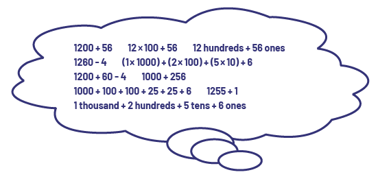 A number can be represented in different ways using mathematical symbols, either by respecting the value of the position of each digit (1 236 is equal to \(1\;000 + \;200 + \;30 + \;6\)), by using variations of place values (1236 equals 12 hundreds and 36 ones) or by performing different operations (1236 equals \(1\;000\; + \;236\) or \(1\;240\; - \;4\)) or \(1\;200\; + \;36\) or \(1\;000\; + \;100\; + \;100\; + \;15\; + \;15\; + \;6\)). In fact, there are an infinite number of ways of representing a number, each of which allows students to develop a different way of interpreting it and understanding its meaning.