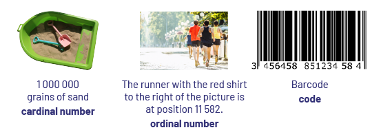 The context also allows us to recognize that the same number does not always have the same meaning. The common interpretation associates them with a quantity, which are cardinal numbers. However, some numbers do not represent quantities, but rather a position, as is the case of ordinal numbers. For example, in a marathon, the runner who is in 11 582nd place is the 11 582nd person to cross the finish line. Numbers can also be used to label or identify as is the case with social insurance numbers, bar codes, license plates, and addresses.
