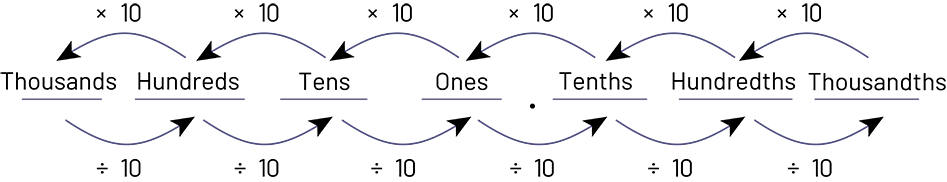 It is important that students also grasp the x10 multiplicative relationship that exists between adjacent position values. Students have previously developed an understanding of this relationship in the study of whole numbers, such that each position has a value 10 times greater than the one to its right and 10 times smaller than the one to its left.