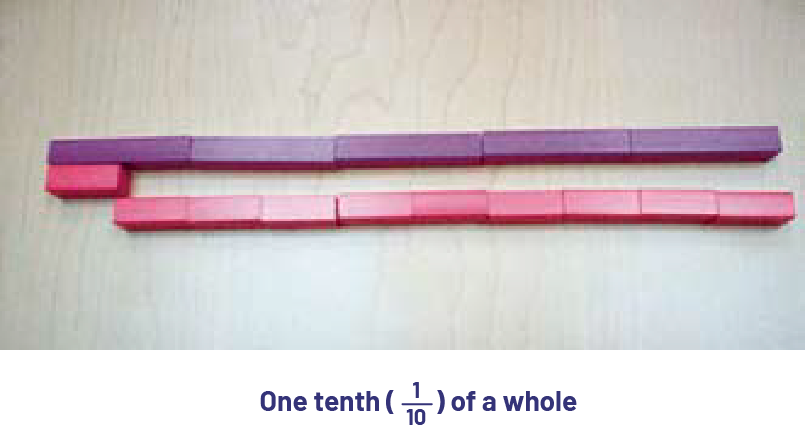 Base ten blocks are excellent tools to represent decimal numbers since they highlight the x10 multiplicative relationship between place values and illustrate the values of digits based on their place. However, it is very important to always clearly define the block that constitutes the whole from which the other blocks will be defined. When studying whole numbers, the small cube was usually associated with ones. However, if we choose the rod as the whole, then the small cube represents one tenth.