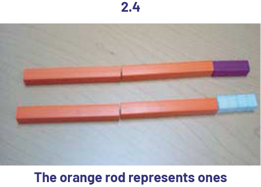When representing decimal numbers using previously learned models, there is an adjustment to be made. For example, where the rod was used to represent ten ones when working with whole numbers, it is used to represent 10 tenths when dealing with fractions and decimals. Similarly, the flat was previously used to represent 100 ones and now represents 100 hundredths. Students must understand that the whole has changed and that they must now think about the blocks differently.