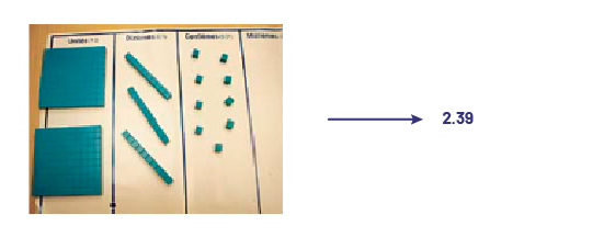 Once students have become accustomed to recognizing and representing tenths and hundredths, they can begin to use concrete materials to represent decimal numbers. Concrete representation of the numbers 2.4 and 0.70, for example, include: