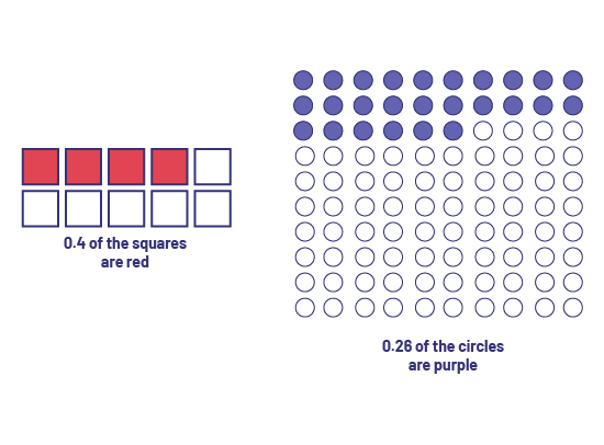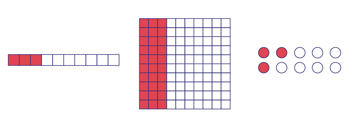 To fully understand decimal numbers, it is important for students to be able to represent them concretely using manipulatives (for example, counters, base ten blocks). Therefore, in the junior grades, students should have the opportunity to explore decimal numbers using these materials to build conceptual understanding. Before beginning to teach decimal numbers, it is important to have students use manipulatives to show the parts of a whole that are decimal tenths and hundredths (for example, \(\frac{3}{ {10}}\), \(\frac{{12}}{{100}}\)).