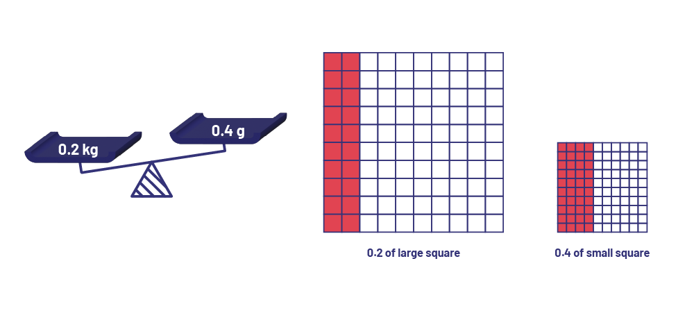 In these examples, even though the number 0.2 is less than the number 0.4 (0.2 < 0.4), 0.2 kg is a larger mass than 0.4 g, just as 0.2 of the large square is a larger area than 0.4 of the small square.