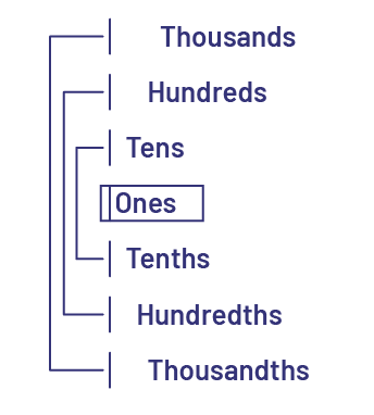 The position of the ones defines the whole according to which the tenths, hundredths, tens, hundreds, and thousands are formed. It can therefore be said that the ones, identified by the decimal point, is at the heart of the decimal number.