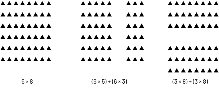 The following example illustrates how the distributive property can be used to calculate \(6\; \times \;8\). In one case, we decompose the factor 8 to obtain \(5\; + \;3\). We then have \(6\; \times \;\left( {5\; + \;3} \right)\; = \left( {6\; \times \;5} \right)\; + \;\left( {6\; \times \;3} \right)\). In the other case, we decompose the factor 6 to obtain \(3\; + \;3\). We then have \(\left( {3\; + \;3} \right)\; \times \;8\; = \left( {3\; \times \;8} \right)\; + \;\left ( {3\; \times \;8} \right)\).