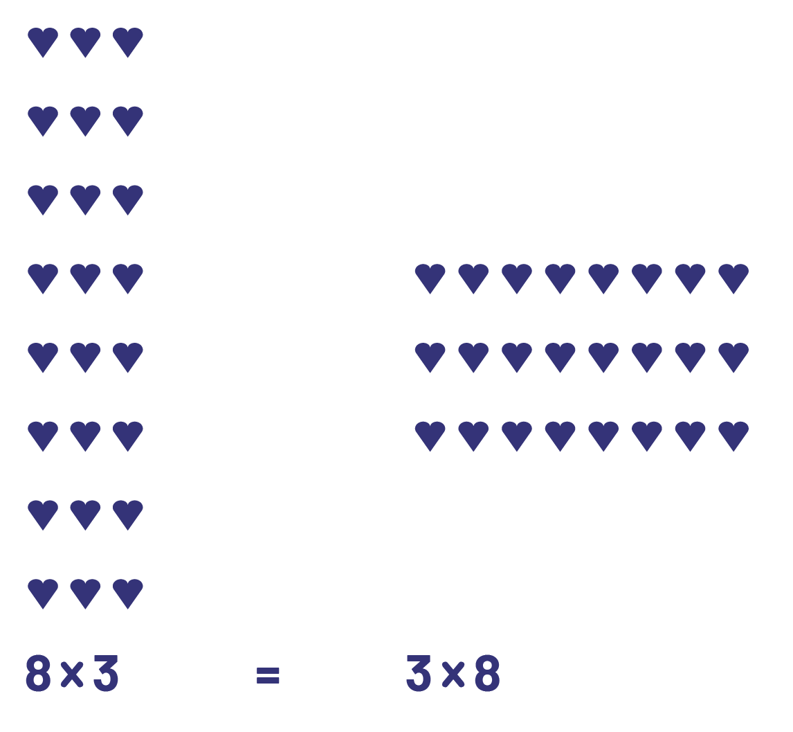 We can also demonstrate the commutative property of multiplication. For example, \(8 \times 3\) and \(3 \times 8\).
