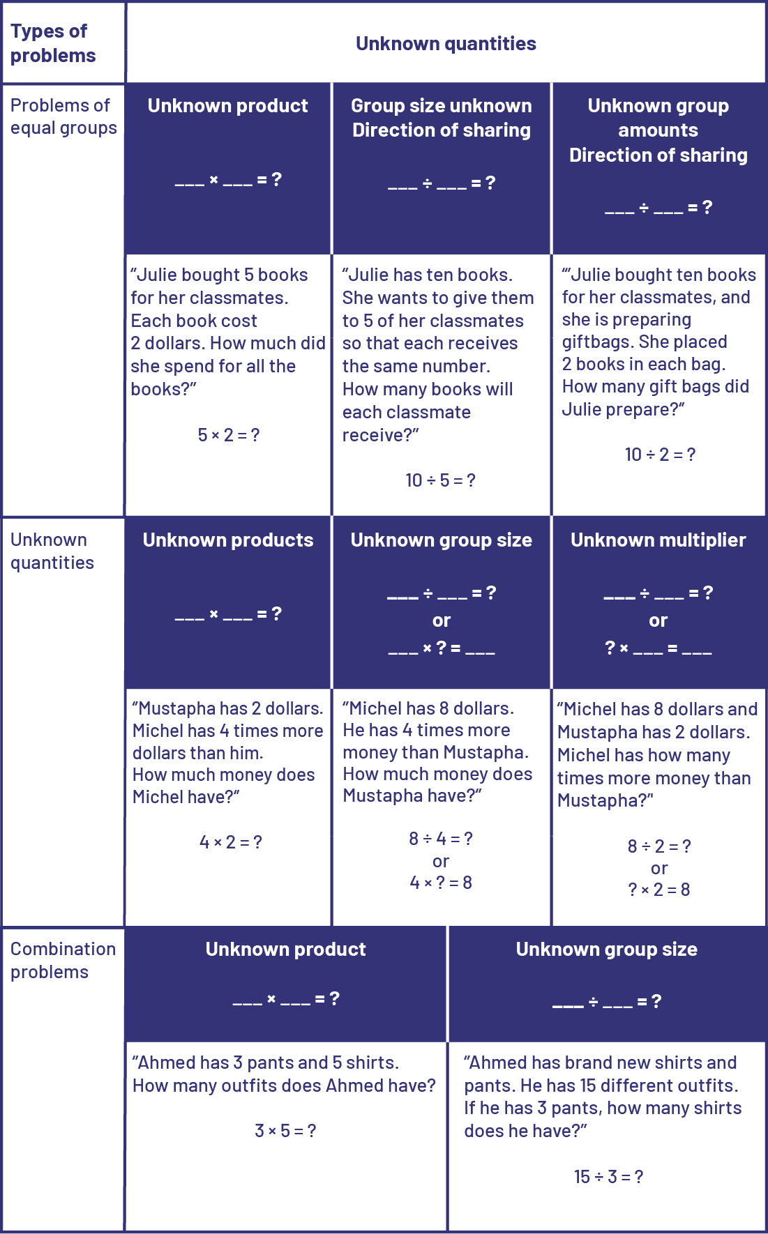 It is essential that both types of situations be addressed, as they are the basis for the integration of other mathematical concepts. It is not necessary for students to know the names of the situation types, but it is essential that they have the opportunity to solve a variety of problem types, while using a variety of strategies.