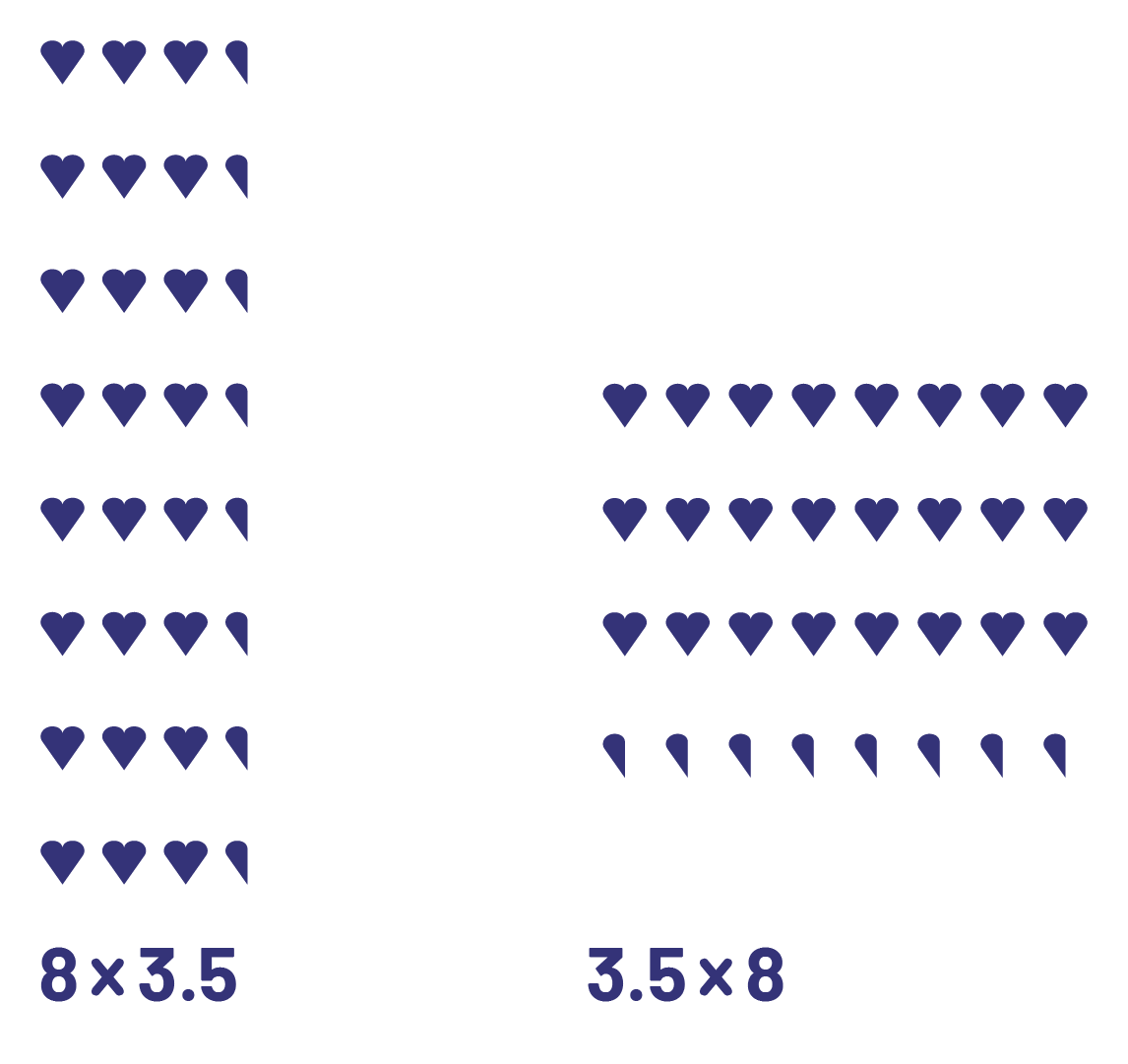 The two previous arrays represent the same total quantity, organized in two different ways. As a result, they illustrate two different situations. Thus, \(8\; \times \;3\) represents 8 rows of 3 objects and \(8\; \times \;3.5\) represents 8 rows of 3.5 objects, while \(3\ \times \;8\) represents 3 rows of 8 objects and \(3.5\; \times \;8\) represents 3.5 rows of 8 objects. It is important that students recognize the different representations.