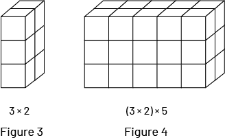 In Figure 1, we see that there are 2 rows of 5 cubes, that is, \(2\; \times \;5\) cubes. In Figure 2, we see 3 layers of \(2\; \times \;5\) cubes representing \(3\; \times \;(2\; \times \;5)\) cubes.
