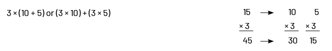 There is an important connection between the distributive property and the standard multiplication algorithm. For example, to calculate \(3\; \times \;15\), the 15 is broken down to get \(\left( {10\; + \;5} \right)\):