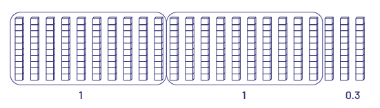 I know I need 10 small cubes to make a rod, which is equal to one tenth. I can visualize 2 groups of 10 small cubes with 3 small cubes left over.