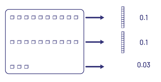 Multiply by one hundredth is the same as dividing by 100. So to calculate \(23\; \times \;0.01\), I visualized the number 23 divided into 100 equal groups. I decomposed 23 into 20 + 3.