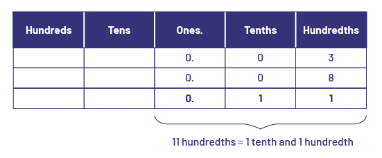 When adding decimal numbers, the concept of grouping is used just as when adding whole numbers. For example, just as we can add 3 hundreds to 8 hundreds to form 11 hundreds, we can add 3 hundredths to 8 hundredths to form 11 hundredths. However, since the decimal system does not allow two digits to be placed in the same position, students must understand the concept of regrouping.