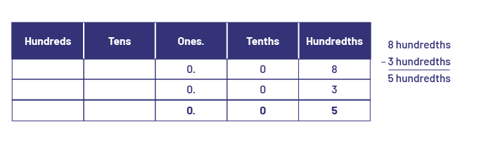 During subtraction, it is important, as it is with addition, to consider the place value of the digits that make up the numbers. The strategies for subtracting decimal numbers are essentially the same as those used for subtracting whole numbers. For example, just as one can subtract 3 hundreds from 8 hundreds and get 5 hundreds, one can subtract 3 hundredths from 8 hundredths to get 5 hundredths.