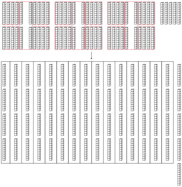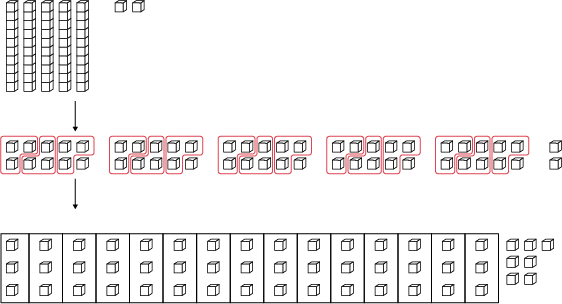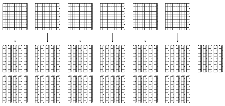 This modelling allows students to visualize sharing and build a conceptual understanding of division. Teachers can help students make connections between sharing using the base ten blocks and the steps in the standard division algorithm.
