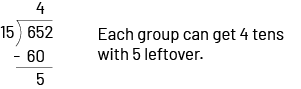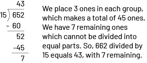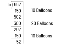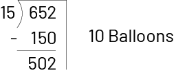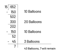 Students can then conclude that each friend will receive 43 balloons (4 tens and 3 ones) and that 7 balloons are left over and will not be shared (652 ÷ 15 = 43 R7).