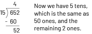 The remaining 5 tens and 2 ones must then be shared among the 15 friends. The 5 tens are exchanged for 50 ones in order to proceed with the sharing.