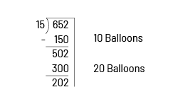 Another way to do division is to use a sum of partial quotients based on prior knowledge. This strategy has the advantage of developing a sense of the relative size of numbers. For example, to divide the 652 balloons, students may first recognize that it is possible to distribute 10 balloons to each of 15 friends. They then calculate that this will result in the distribution of 150 balloons and that there will be 502 left.