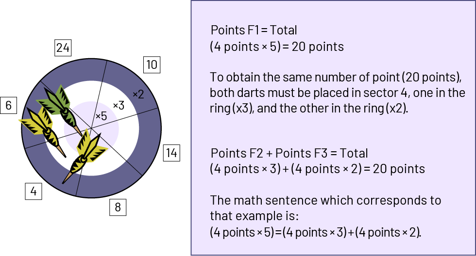 Initially, the focus is on the equal relationship between the points generated by one dart and the sum of the points obtained by two other darts. Later, through play, analysis of the game, and discussion, the importance of the distributive property as a game strategy will be highlighted.
