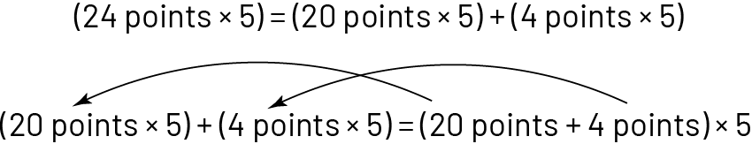Number sentence: \(\left( {8\;{\rm{points}}\; \times \;{\rm{3}}} \right)\; + \;\left( {6\;{\rm{points}}\; \times \;{\rm{3}}} \right)\; = \;14\;{\rm{points}}\; \times \;{\rm{3}}\)