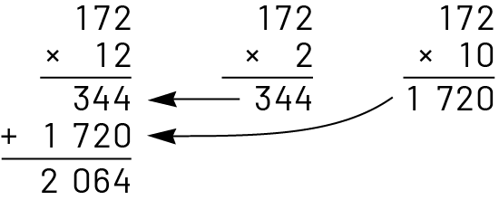 Then suggest that students explain how this strategy can help them manipulate more difficult number facts (for example, \(15 \times \;4 = \;\left( {15 \times \;2} \right)\; + \;\left( {15 \times \;2} \right)\; = \;60\)) or to multiply a three-digit number by a two-digit number (for example, \(172\; \times \;12\; = \;\left( {172\; \times \;10} \right)\; + \;\left( {172\; \times \;2} \right)\) or \(\left( {100\; \times \;12} \right)\; + \;\left( {70\; \times \;12} \right)\; + \;\left( {2\; \times \;12} \right)\).
