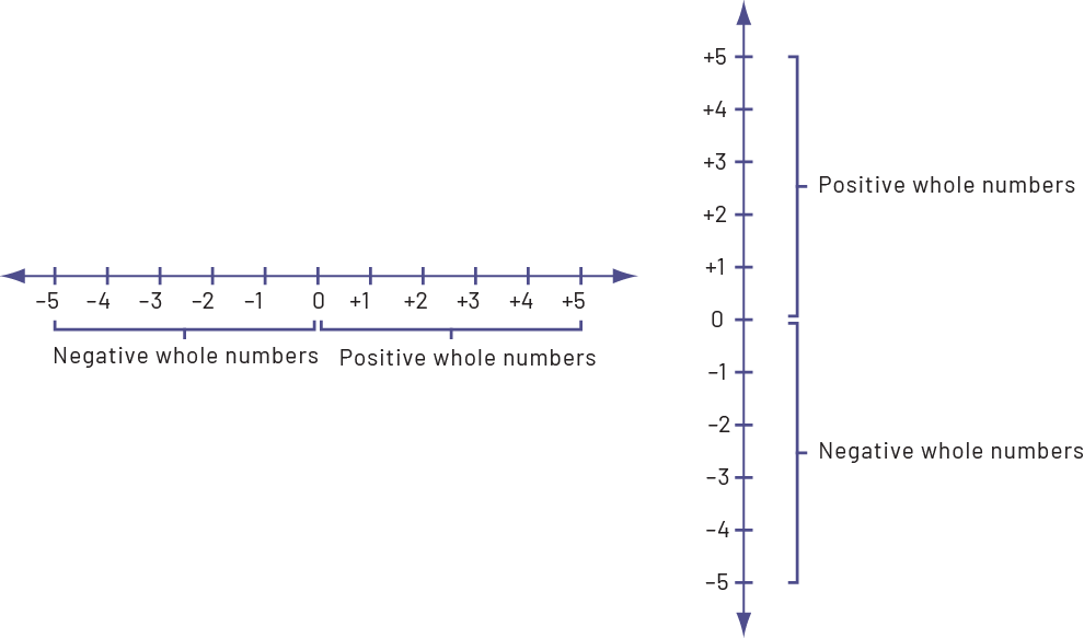 The positive or negative sign indicates whether the number is greater or less than 0. If the number is positive, it will be placed to the right of 0 on a horizontal number line or above 0 on a vertical number line. If the number is negative, it will be placed to the left of 0 on a horizontal number line or below 0 on a vertical number line. The reference number for integers is therefore always 0.