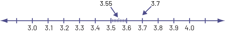 Ordering is best understood by comparing decimal numbers in contextualized situations. For example: "Remi did a jump of 3.55 m and Samantha did one of 3.7 m. Which of the two had the longer jump?" Students can respond and justify their choice if they understand place value. The number line is a powerful visual model for comparing decimal numbers. To place 3.7 on a number line, students can represent tenths from 3.0 to 4.0. To place 3.55, they must divide the interval between 3.5 and 3.6 into tenths, with each space representing one hundredth. They can then conclude that 3.55 < 3.7, so Samantha has taken a longer jump than Remi.