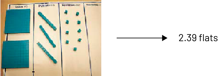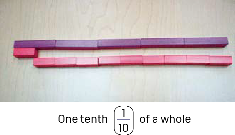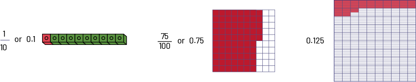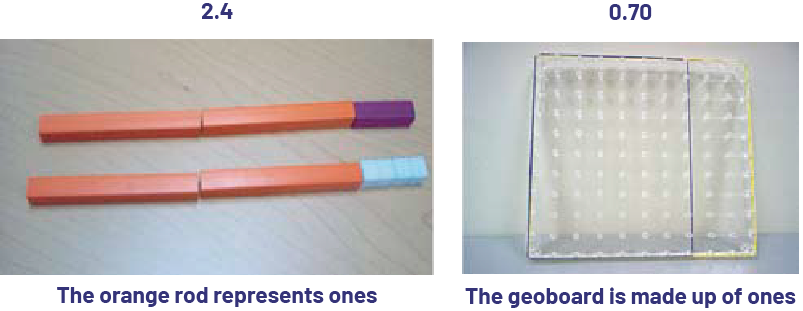 When representing decimal numbers using models, there is an adjustment to be made, as these same models were previously used to represent other concepts (for example, the rod represented ten ones). Students need to understand that the whole has changed. In the first of the three examples above, the train represents the whole; in the second example, the flat represents the whole.