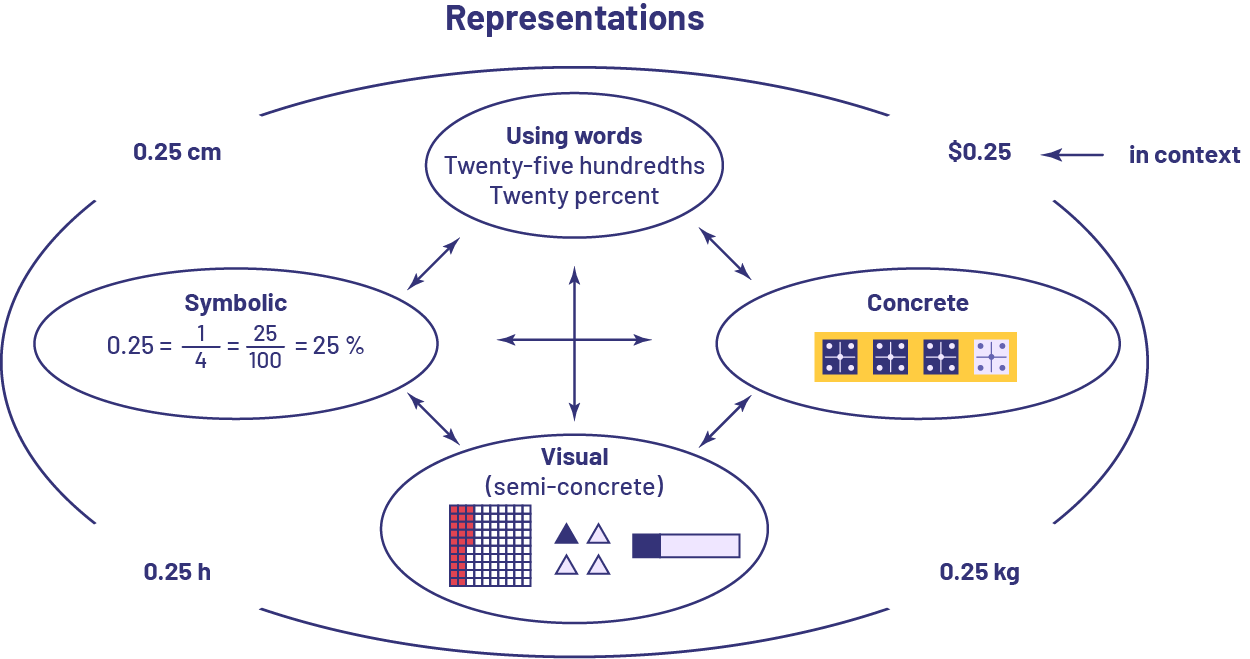 The following figure illustrates various ways to represent twenty-five hundredths concretely, visually (semi-concretely), symbolically, and with words. It also demonstrates how 0.25 is used in different contexts. Students develop a better understanding of numbers if they are regularly asked in a variety of situations to move from one representation to another.