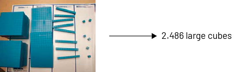 If we choose the large cube as the whole, then the small cube represents one thousandth of the large cube, the rod represents one hundredth of the large cube and the flat represents one tenth of the large cube. For example: