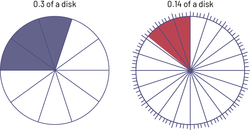 Students can also develop a conceptual understanding of decimal numbers and percents by representing them in visual or semi-concrete ways. For example, a disk divided into 10 equal parts can represent tenths and a disk divided into 100 equal parts can represent hundredths.