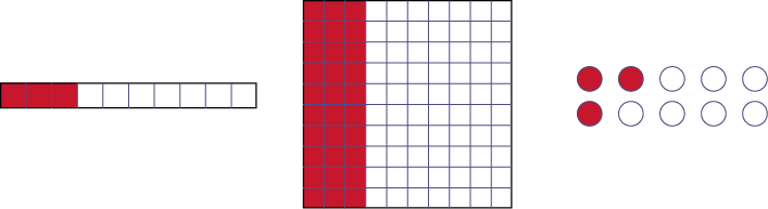 In order to fully understand decimal numbers, it is important that students be able to represent them concretely using manipulatives (for example, using counters or base ten blocks). Therefore, in the junior grades, students should have the opportunity to explore numbers using these materials to build conceptual understanding. Before beginning to teach decimal numbers, it is important to have students use manipulatives to show the parts of a whole that is represented by a decimal fraction (for example, \(\frac{3}{10}\)).