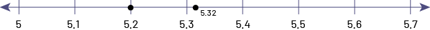 Number line to locate the numbers 5.2 and 5.32: