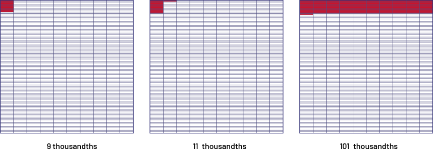 Their knowledge of fractions enables students to represent these quantities by \(\frac{9}{1000}\), \(\frac{11}{1000}\) and \(\frac{101}{1000}\), and their understanding of the concept of place value enables them to recognize that the first fraction, expressed in decimal notation, is written 0.009. However, it's not obvious that the other two are written as 0.011 and 0.101. For example, to understand that 0.011 represents 11 thousandths, it is useful to demonstrate with a grouping that 11 thousandths is equivalent to "1 hundredth plus 1 thousandth".