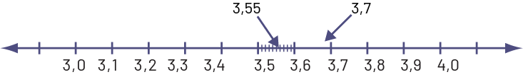 Learning to compare decimal numbers is best done in contextualized situations. For example: "Remi did a jump of 3.55 m and Samantha did one of 3.7 m. Which of the two had the longer jump?" Students can respond and justify their choice if they understand place value. The number line is a powerful visual model for comparing decimal numbers. To place 3.7 on a number line, students can represent tenths from 3.0 to 4.0. To place 3.55, they must partition the interval between 3.5 and 3.6 into tenths, with each space representing one hundredth. They can then conclude that 3.55 < 3.7, so Samantha has taken a longer jump than Remi.