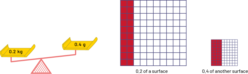 In these examples, even though the number 0.2 is less than the number 0.4 (\(0.2 < 0.4\)), 0.2 kg is a larger mass than 0.4 g, just as 0.2 of the large square is a larger area than 0.4 of the small square.