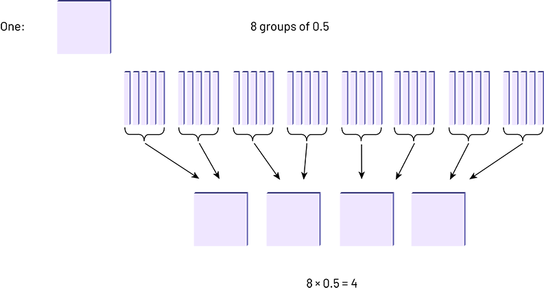 If the students understand that \(3\; \times \;4\) means 3 groups of 4, they will be able to understand the meaning of 8 × 0.5, or 8 groups of 0.5 as shown in the following illustration in which a flat represents one whole.