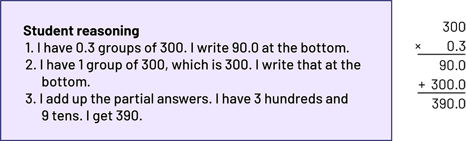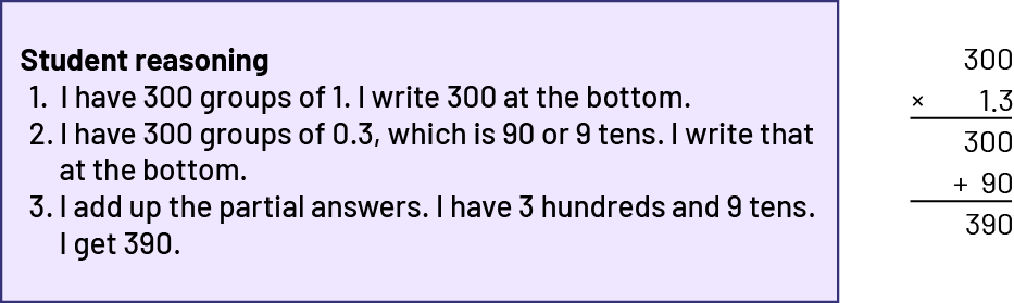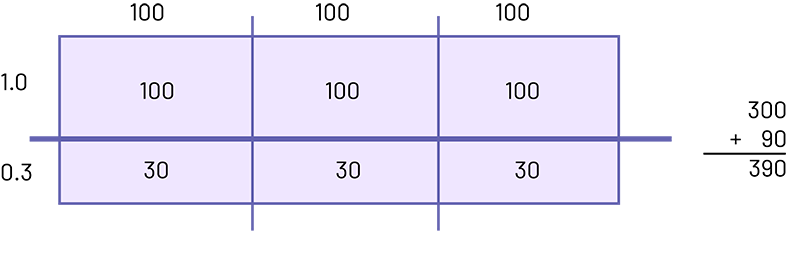 I decomposed 1.3 into \(1\; + \;0.3\). I multiplied \(300 \times 1\).