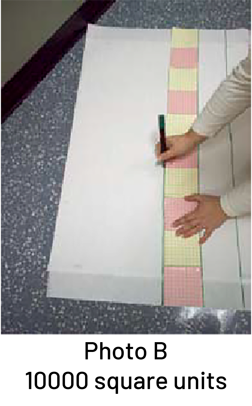 Give each student two copies of Figure 3 (100 square units). Group the students into groups of five and ask them to represent 1000 square units. They could arrange them to form a large strip measuring 10 cm by 100 cm (Photo A) from their 10 copies of 100 square units.