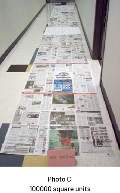 Now ask all students in the class to come together to represent 100 000 square units. For example, they could assemble 10 representations of 10 000 square units (Photo C) to form a 100 cm by 1000 cm strip. Provide a large enough space (for example., hallway) since the strip will be 10 m long.