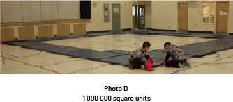 To represent 1 000 000 square units, go outside or to the gym and assemble 10 large strips of 100 000 square units, or mark out the space that these 10 strips would occupy, to form a 1000 cm by 1000 cm square (Photo D).