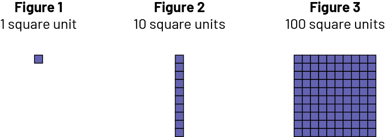 Show students the small square (Figure 1) and tell them that it represents 1 square unit. Then show a strip that equals 10 square units (Figure 2) and ask them how to represent 100 square units. Using their number sense and previous experiences with base ten blocks, students should respond that they can put 10 strips together to form a large 10 cm by 10 cm square (Figure 3). It is important to emphasize that the 10 strips constitute 10 tens square units or 100 square units.