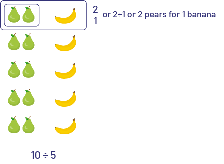 - 10 pears for 5 bananas or \(10\;:\;5\) or \(\frac{10}{5}\)