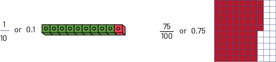 When representing decimal numbers using models, there is an adjustment to be made since these same models were previously used differently. For example, where the rod represented ten ones, it might be representing one whole when exploring decimals. Students must understand that the unit or value assigned to each block has changed. In the examples above, the rod (whole) represents 10 tenths, and each cube is one tenth. The large square (whole) represents 100 hundredths, so each small square is one hundredth.