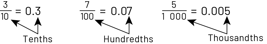 Students need to understand that since decimal notation is just another way of representing a decimal fraction, it is then possible to establish an equality relationship between the two notations (for example, \(0.3\; = \;\frac{3}{{10}}\)). By recognizing this equality, students are better able to associate a place value with each of the digits (for example, tenths, hundredths) that make up a decimal number.
