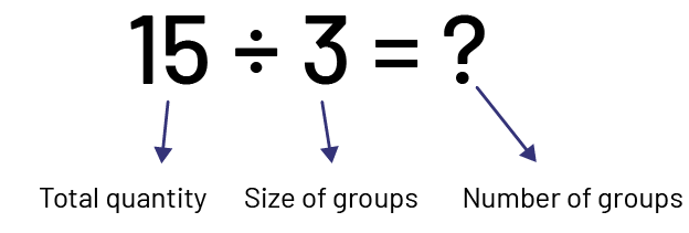 With quotative division the total quantity and the size of the groups are known (for example, we have 15 apples and we want to put them in bags, 3 apples per bag; we look for the number of bags we need).